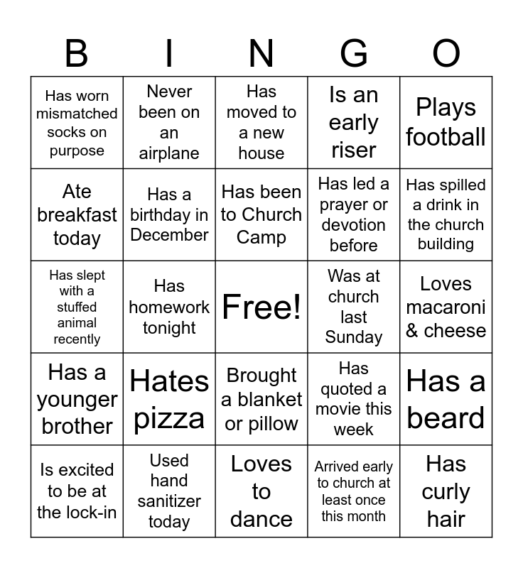This bingo card has a free space and 71 words: Is an only child, Never been on an airplane, Loves to play video games, Has a pet lizard, Loves to dance, Has a pet cat, Is an early riser, Has ridden a horse, Has led a prayer or devotion before, Has memorized two Bible verses, Is excited to be at the lock-in, Has prayed for someone this week, Has spilled a drink in the church building, Has worn mismatched socks on purpose, Has accidentally called a teacher “mom” or “dad”, Has slept with a stuffed animal recently, Has quoted a movie this week, Plays football, Has been to 3 continents, Loves macaroni & cheese, Hates pizza, Has curly hair, Has a beard, Has made a YouTube video, Has written a blog, Likes reading, Has rewatched the same movie more than 6 times, Forgot to charge their phone last night, Can speak another language, Met someone new tonight, Used hand sanitizer today, Brushed their teeth today, Tried a new snack this month, Sat in a different seat at church recently, Arrived early to church at least once this month, Used a pencil today, Packed a lunch recently, Brought a backpack tonight, Ate breakfast today, Used emojis today, Brought a blanket or pillow, Feels tired right now, Has a younger brother, Is the oldest sibling, Is the youngest sibling, Has more than two siblings, Has a birthday in the summer, Has a birthday in December, Has eaten something that fell on the floor in the last 72 hours, Has forgotten song lyrics mid-song during worship service, Has whispered something that wasn’t quiet, Has laughed at something they shouldn’t have, Was at church last Sunday, Has broken a bone, Has been baptized, Has helped with Vacation Bible School, Has been to Church Camp, Can name two of the disciples, Is homeschooled, Goes to private or Christian school, Is in band or choir, Has taken a test this week, Has homework tonight, Plays an instrument, Can swim, Has been on an airplane, Has moved to a new house, Does yoga, Can do a cartwheel, Was born in June and Has an older sister.