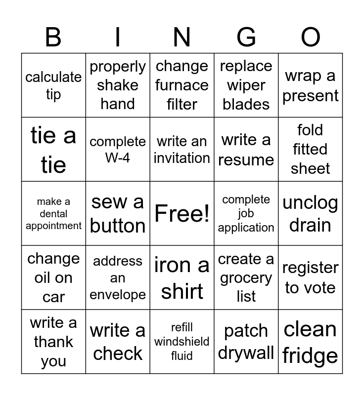This bingo card has a free space and 24 words: address an envelope, write a check, write an invitation, write a thank you, wrap a present, calculate tip, tie a tie, properly shake hand, complete job application, iron a shirt, write a resume, make a dental appointment, create a grocery list, register to vote, complete W-4, patch drywall, unclog drain, change furnace filter, fold fitted sheet, sew a button, clean fridge, change oil on car, replace wiper blades and refill windshield fluid.