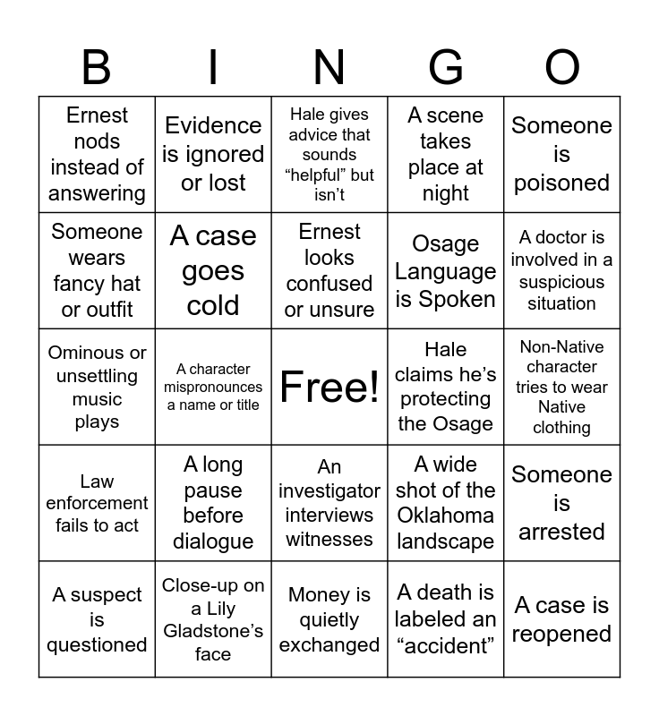 This bingo card has a free space and 34 words: An Osage dies under suspicious circumstances, A death is labeled an “accident”, A will or inheritance is discussed, A bombing or explosion is referenced, Law enforcement fails to act, A case goes cold, Someone is poisoned, A suspect is questioned, Evidence is ignored or lost, Ernest takes off his hat, Ernest looks confused or unsure, Hale gives advice that sounds “helpful” but isn’t, Mollie shows strength through silence, Mollie questions someone she trusts, Hale claims he’s protecting the Osage, A doctor is involved in a suspicious situation, Close-up on a Lily Gladstone’s face, Ominous or unsettling music plays, A long pause before dialogue, A wide shot of the Oklahoma landscape, An investigator interviews witnesses, Jurisdiction is discussed, Ernest nods instead of answering, Non-Native character tries to wear Native clothing, Money is quietly exchanged, A case is reopened, A scene takes place at night, Food or drink is emphasized, Osage Language is Spoken, Someone wears fancy hat or outfit, A non-Native character clearly misunderstands Osage customs, A character mispronounces a name or title, Someone is arrested and Someone Drinks too Much.