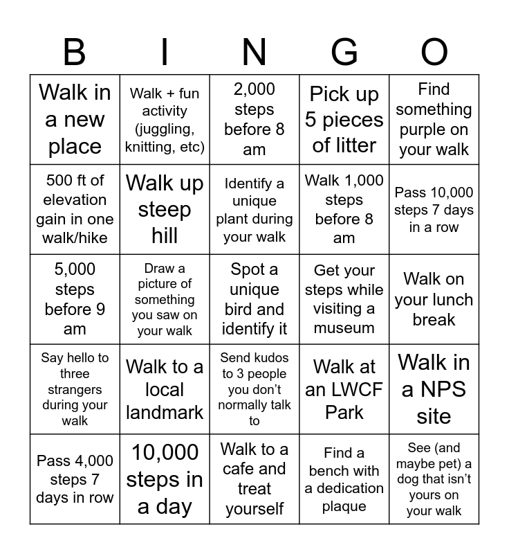 This bingo card has a free space and 47 words: Walk for 33 minutes, See (and maybe pet) a dog that isn’t yours on your walk, Find some barn yard animals, Walk to a cafe and treat yourself, Walk to a local landmark, Walk to a historic neighborhood, Walk + fun activity (juggling, knitting, etc), Walk with a friend, 500 ft of elevation gain in one walk/hike, 300 ft of elevation gain in one walk/hike, Walk up steep hill, Pick up 5 pieces of litter, Walk in a NPS site, Walk at an LWCF Park, Walk during sunrise (indoors or outdoors), Walk during sunset (indoors or outdoors), Identify a unique plant during your walk, Get your steps while visiting a museum, Find something yellow on your walk, Find something purple on your walk, Draw a picture of something you saw on your walk, Find a bench with a dedication plaque, Walk in a new place, Walk 1,000 steps before 8 am, Participate in a Virtual Group Walk with coworkers, Pass 10,000 steps 7 days in a row, Pass 4,000 steps 7 days in row, Pass 2,500 every day for 15 days, Send kudos to 3 people you don’t normally talk to, Say hello to three strangers during your walk, Walk while attending a meeting, Send a teammate a walking playlist or podcast, Catch up with an old friend on the phone, Find a Geocache on your walk, Listen to a new song while walking, 10,000 steps in a day, Walk on your lunch break, Walk after dinner, Walk with a group, Go on a walk, Find a cat on your walk, 2,000 steps before 8 am, 5,000 steps before 9 am, Speedwalk around your house, Find 3 unique plants on your walk, Walk for 22 minutes and Make up a poem while walking.