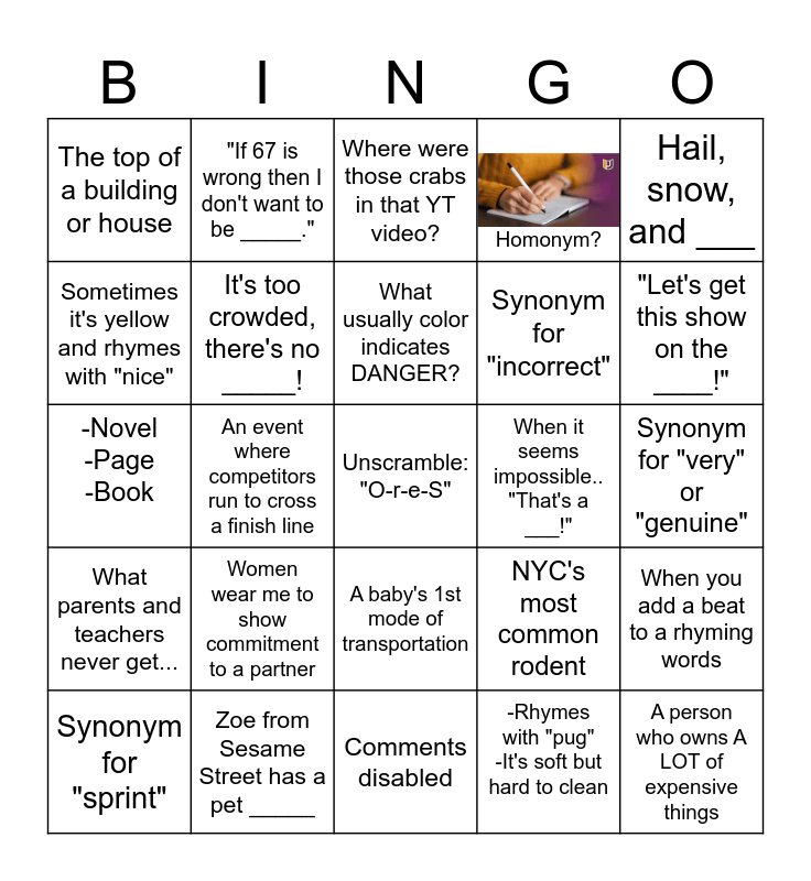 This bingo card has 1 images, a free space and 24 words: Women wear me to show commitment to a partner, Zoe from Sesame Street has a pet _____, What usually color indicates DANGER?, Synonym for "sprint", Hail, snow, and ___, The top of a building or house, Sometimes it's yellow and rhymes with "nice", "If 67 is wrong then I don't want to be _____.", When it seems impossible.. "That's a ___!", A baby's 1st mode of transportation, Synonym for "incorrect", -Novel -Page -Book, NYC's most common rodent, When you add a beat to a rhyming words, It's too crowded, there's no _____!, -Rhymes with "pug" -It's soft but hard to clean, Synonym for "very" or "genuine", Where were those crabs in that YT video?, "Let's get this show on the ____!", An event where competitors run to cross a finish line, A person who owns A LOT of expensive things, What parents and teachers never get..., Homonym? and Comments disabled.