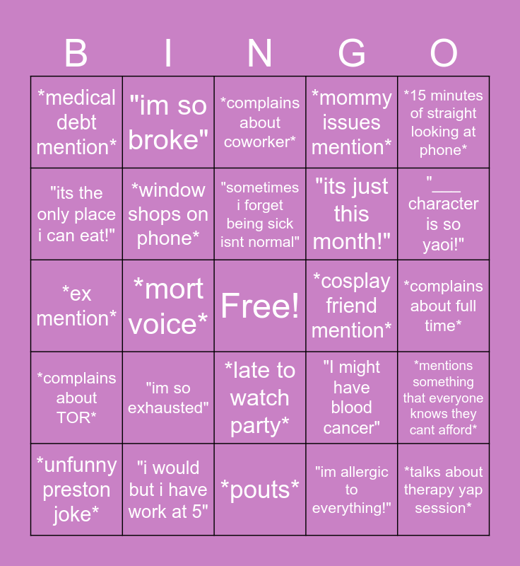 This bingo card has a free space and 24 words: "im so exhausted", "i would but i have work at 5", "sometimes i forget being sick isnt normal", *unfunny preston joke*, *15 minutes of straight looking at phone*, *medical debt mention*, "its the only place i can eat!", "im so broke", *cosplay friend mention*, *late to watch party*, "its just this month!", *ex mention*, "I might have blood cancer", *mentions something that everyone knows they cant afford*, *window shops on phone*, "im allergic to everything!", *complains about full time*, *complains about coworker*, "___ character is so yaoi!", *mort voice*, *talks about therapy yap session*, *complains about TOR*, *mommy issues mention* and *pouts*.