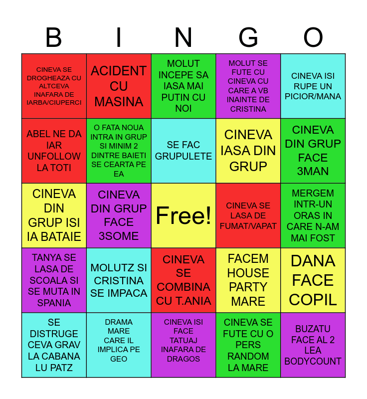 This bingo card has a free space and 24 words: MOLUTZ SI CRISTINA SE IMPACA, DRAMA MARE CARE IL IMPLICA PE GEO, SE FAC GRUPULETE, SE DISTRUGE CEVA GRAV LA CABANA LU PATZ, CINEVA ISI RUPE UN PICIOR/MANA, CINEVA SE DROGHEAZA CU ALTCEVA INAFARA DE IARBA/CIUPERCI, ABEL NE DA IAR UNFOLLOW LA TOTI, ACIDENT CU MASINA, CINEVA SE LASA DE FUMAT/VAPAT, CINEVA SE COMBINA CU T.ANIA, CINEVA IASA DIN GRUP, CINEVA DIN GRUP ISI IA BATAIE, FACEM HOUSE PARTY MARE, DANA FACE COPIL, O FATA NOUA INTRA IN GRUP SI MINIM 2 DINTRE BAIETI SE CEARTA PE EA, CINEVA SE FUTE CU O PERS RANDOM LA MARE, MERGEM INTR-UN ORAS IN CARE N-AM MAI FOST, MOLUT INCEPE SA IASA MAI PUTIN CU NOI, CINEVA DIN GRUP FACE 3MAN, CINEVA DIN GRUP FACE 3SOME, BUZATU FACE AL 2 LEA BODYCOUNT, TANYA SE LASA DE SCOALA SI SE MUTA IN SPANIA, MOLUT SE FUTE CU CINEVA CU CARE A VB INAINTE DE CRISTINA and CINEVA ISI FACE TATUAJ INAFARA DE DRAGOS.