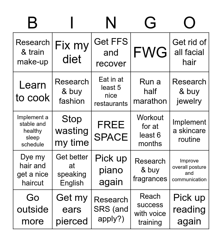 This bingo card has a free space and 24 words: Get better at speaking English, Get my ears pierced, Eat in at least 5 nice restaurants, Go outside more, Get rid of all facial hair, Research & train make-up, Learn to cook, Fix my diet, Workout for at least 6 months, Pick up piano again, Run a half marathon, Implement a stable and healthy sleep schedule, Research & buy fragrances, Improve overall posture and communication, Research & buy fashion, Reach success with voice training, Implement a skincare routine, Get FFS and recover, Research & buy jewelry, Stop wasting my time, Pick up reading again, Dye my hair and get a nice haircut, FWG and Research SRS (and apply?).