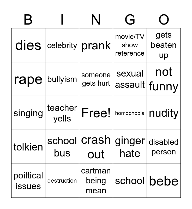 This bingo card has a free space and 24 words: school bus, destruction, someone gets hurt, poiltical issues, gets beaten up, dies, rape, celebrity, homophobia, crash out, sexual assault, singing, ginger hate, disabled person, bullyism, school, nudity, prank, not funny, teacher yells, bebe, tolkien, movie/TV show reference and cartman being mean.