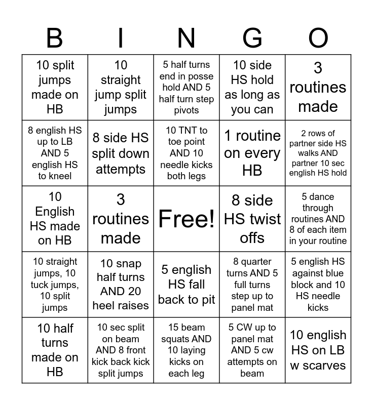 This bingo card has a free space and 24 words: 10 snap half turns AND 20 heel raises, 10 sec split on beam AND 8 front kick back kick split jumps, 10 TNT to toe point AND 10 needle kicks both legs, 10 half turns made on HB, 3 routines made, 10 split jumps made on HB, 8 english HS up to LB AND 5 english HS to kneel, 10 straight jump split jumps, 8 side HS twist offs, 5 english HS fall back to pit, 1 routine on every HB, 10 English HS made on HB, 8 quarter turns AND 5 full turns step up to panel mat, 5 english HS against blue block and 10 HS needle kicks, 8 side HS split down attempts, 5 CW up to panel mat AND 5 cw attempts on beam, 5 dance through routines AND 8 of each item in your routine, 5 half turns end in posse hold AND 5 half turn step pivots, 2 rows of partner side HS walks AND partner 10 sec english HS hold, 3 routines made, 10 english HS on LB w scarves, 10 straight jumps, 10 tuck jumps, 10 split jumps, 10 side HS hold as long as you can and 15 beam squats AND 10 laying kicks on each leg.