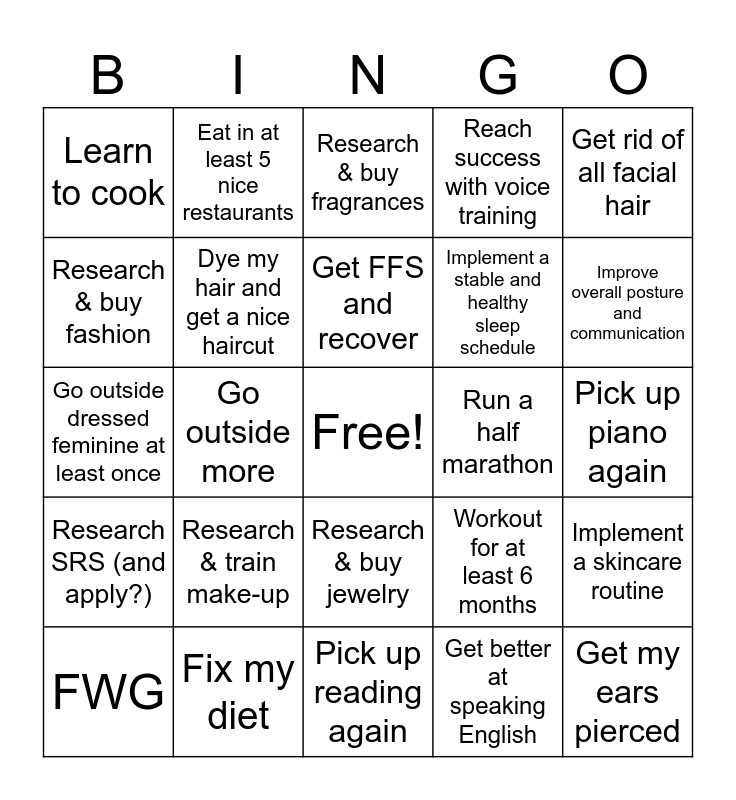 This bingo card has a free space and 24 words: Research & train make-up, Fix my diet, Get FFS and recover, FWG, Get rid of all facial hair, Learn to cook, Research & buy fashion, Eat in at least 5 nice restaurants, Run a half marathon, Research & buy jewelry, Implement a stable and healthy sleep schedule, Go outside dressed feminine at least once, Workout for at least 6 months, Implement a skincare routine, Dye my hair and get a nice haircut, Get better at speaking English, Pick up piano again, Research & buy fragrances, Improve overall posture and communication, Go outside more, Get my ears pierced, Research SRS (and apply?), Reach success with voice training and Pick up reading again.