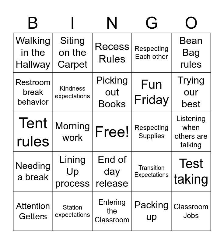 This bingo card has a free space and 24 words: Lining Up process, Station expectations, Picking out Books, Attention Getters, Bean Bag rules, Walking in the Hallway, Restroom break behavior, Siting on the Carpet, Respecting Supplies, End of day release, Fun Friday, Tent rules, Transition Expectations, Test taking, Kindness expectations, Packing up, Listening when others are talking, Recess Rules, Trying our best, Morning work, Classroom Jobs, Needing a break, Respecting Each other and Entering the Classroom.