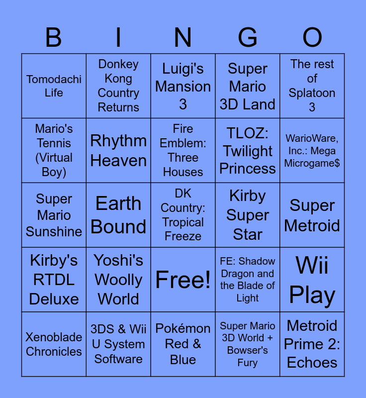 This bingo card has 26 words: Free!, Super Mario 3D World + Bowser's Fury, Fire Emblem: Three Houses, 3DS & Wii U System Software, The rest of Splatoon 3, Tomodachi Life, Mario's Tennis (Virtual Boy), Donkey Kong Country Returns, Super Metroid, FE: Shadow Dragon and the Blade of Light, TLOZ: Twilight Princess, Super Mario Sunshine, Wii Play, Xenoblade Chronicles, Earth Bound, Kirby's Adventure, Super Mario 3D Land, Kirby's RTDL Deluxe, Luigi's Mansion 3, DK Country: Tropical Freeze, WarioWare, Inc.: Mega Microgame$, Pokémon Red & Blue, Kirby Super Star, Yoshi's Woolly World, Rhythm Heaven and Metroid Prime 2: Echoes.