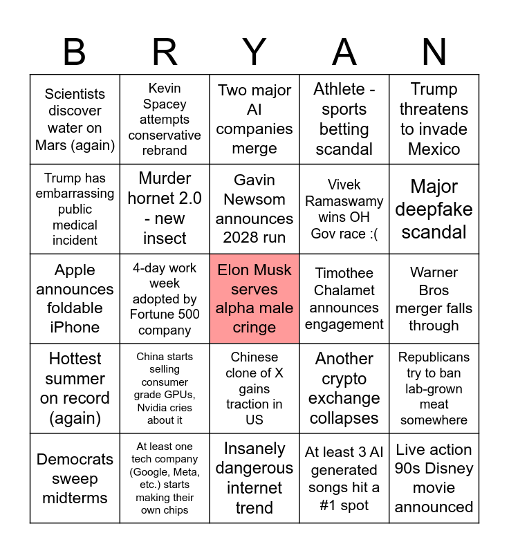 This bingo card has a free space and 24 words: China starts selling consumer grade GPUs, Nvidia cries about it, At least one tech company (Google, Meta, etc.) starts making their own chips, Gavin Newsom announces 2028 run, Democrats sweep midterms, Trump threatens to invade Mexico, Scientists discover water on Mars (again), Trump has embarrassing public medical incident, Kevin Spacey attempts conservative rebrand, Timothee Chalamet announces engagement, Chinese clone of X gains traction in US, Vivek Ramaswamy wins OH Gov race :(, Apple announces foldable iPhone, Another crypto exchange collapses, Republicans try to ban lab-grown meat somewhere, Murder hornet 2.0 - new insect, At least 3 AI generated songs hit a #1 spot, Warner Bros merger falls through, Two major AI companies merge, Major deepfake scandal, 4-day work week adopted by Fortune 500 company, Live action 90s Disney movie announced, Hottest summer on record (again), Athlete -sports betting scandal and Insanely dangerous internet trend.