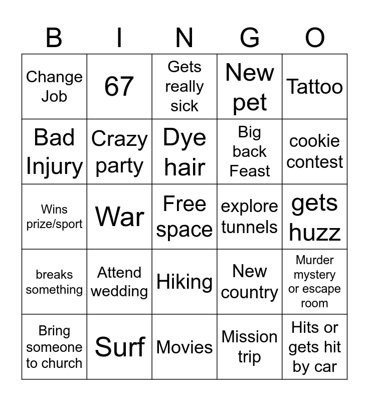 This bingo card has a free space and 24 words: Attend wedding, Surf, Dye hair, Bring someone to church, Tattoo, Change Job, Bad Injury, 67, explore tunnels, Hiking, Big back Feast, Wins prize/sport, New country, Murder mystery or escape room, Crazy party, Mission trip, gets huzz, Gets really sick, cookie contest, War, Hits or gets hit by car, breaks something, New pet and Movies.