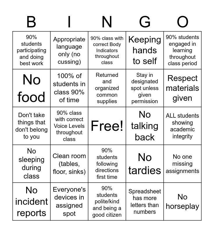 This bingo card has a free space and 24 words: Clean room (tables, floor, sinks), Everyone's devices in assigned spot, Returned and organized common supplies, No incident reports, 90% students engaged in learning throughout class period, 90% students participating and doing best work, No food, Appropriate language only (no cussing), No talking back, 90% students following directions first time, Stay in designated spot unless given permission, Don't take things that don't belong to you, No tardies, No one missing assignments, 100% of students in class 90% of time, Spreadsheet has more letters than numbers, ALL students showing academic integrity, 90% class with correct Body Indicators throughout class, Respect materials given, 90% class with correct Voice Levels throughout class, No horseplay, No sleeping during class, Keeping hands to self and 90% students polite/kind and being a good citizen.