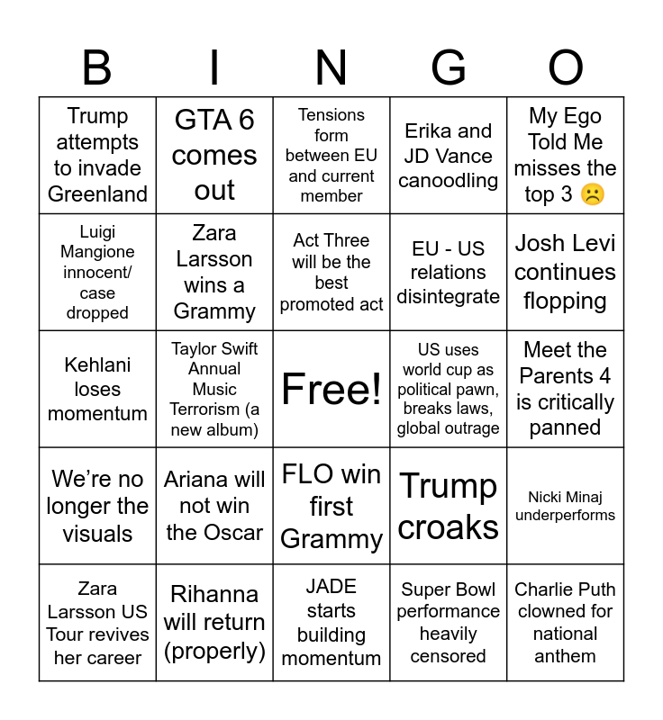 This bingo card has a free space and 24 words: Ariana will not win the Oscar, Rihanna will return (properly), Act Three will be the best promoted act, Zara Larsson US Tour revives her career, My Ego Told Me misses the top 3 ☹️, Trump attempts to invade Greenland, Luigi Mangione innocent/ case dropped, GTA 6 comes out, US uses world cup as political pawn, breaks laws, global outrage, FLO win first Grammy, EU - US relations disintegrate, Kehlani loses momentum, Trump croaks, Nicki Minaj underperforms, Zara Larsson wins a Grammy, Super Bowl performance heavily censored, Meet the Parents 4 is critically panned, Tensions form between EU and current member, Josh Levi continues flopping, Taylor Swift Annual Music Terrorism (a new album), Charlie Puth clowned for national anthem, We’re no longer the visuals, Erika and JD Vance canoodling and JADE starts building momentum.