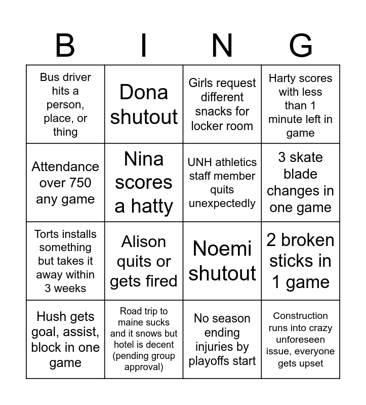 This bingo card has 16 words: Road trip to maine sucks and it snows but hotel is decent (pending group approval), 2 broken sticks in 1 game, Girls request different snacks for locker room, Bus driver hits a person, place, or thing, Torts installs something but takes it away within 3 weeks, Dona shutout, Noemi shutout, No season ending injuries by playoffs start, Attendance over 750 any game, Nina scores a hatty, Hush gets goal, assist, block in one game, Harty scores with less than 1 minute left in game, Alison quits or gets fired, 3 skate blade changes in one game, UNH athletics staff member quits unexpectedly and Construction runs into crazy unforeseen issue, everyone gets upset.