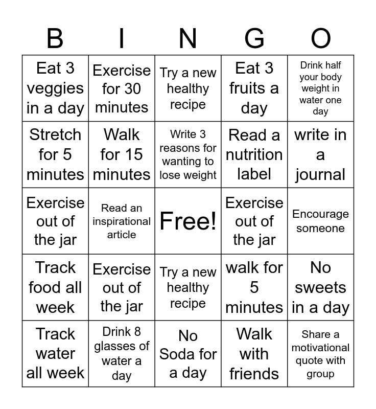 This bingo card has a free space and 25 words: Track water all week, Exercise out of the jar, Write 3 reasons for wanting to lose weight, Walk with friends, write in a journal, Eat 3 veggies in a day, Exercise for 30 minutes, Try a new healthy recipe, Read a nutrition label, No sweets in a day, Exercise out of the jar, Walk for 15 minutes, walk for 5 minutes, Share a motivational quote with group, Stretch for 5 minutes, Drink 8 glasses of water a day, No Soda for a day, Eat 3 fruits a day, Encourage someone, Track food all week, Read an inspirational article, Try a new healthy recipe, Exercise out of the jar, Drink half your body weight in water one day and Stay on track 3 days this week.