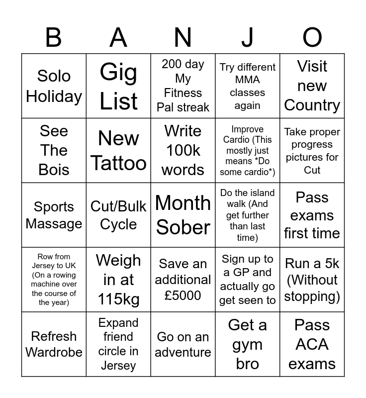 This bingo card has 25 words: Weigh in at 115kg, Go on an adventure, Write 100k words, Refresh Wardrobe, Visit new Country, Solo Holiday, See The Bois, Gig List, Do the island walk (And get further than last time), Save an additional £5000, Improve Cardio (This mostly just means *Do some cardio*), Sports Massage, Sign up to a GP and actually go get seen to, Run a 5k (Without stopping), New Tattoo, Pass ACA exams, Pass exams first time, 200 day My Fitness Pal streak, Take proper progress pictures for Cut, Cut/Bulk Cycle, Month Sober, Expand friend circle in Jersey, Row from Jersey to UK (On a rowing machine over the course of the year), Try different MMA classes again and Get a gym bro.