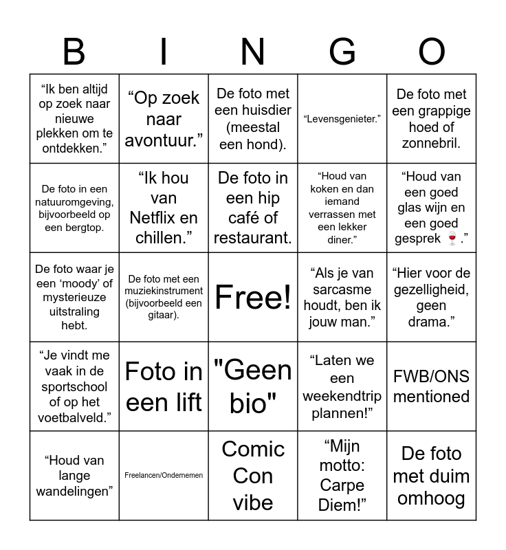 This bingo card has a free space and 77 words: De spiegel-selfie met een fitnesspose., De foto met een groep vrienden, waar je niet goed kunt zien wie de persoon is., De foto met een huisdier (meestal een hond)., De vakantiefoto op strand., De foto waarin je een drankje vasthoudt., De selfie met zonnebril., De foto van je buikspieren in de sportschool., De foto zonder shirt, De foto van de rug, De foto met vis, De foto op een festival, vaak met een groot aantal mensen., De foto waar je bij een auto., De foto in een hip café of restaurant., De foto in een natuuromgeving, bijvoorbeeld op een bergtop., De close-up van je gezicht, waar je in de camera kijkt., De foto met een muziekinstrument (bijvoorbeeld een gitaar)., De foto met Snapchatfilter, De foto met duim omhoog, De foto in de regen, als je probeert "cool" te lijken., De foto met een grappige hoed of zonnebril., De foto waarbij je iets eet, zoals een ijsje., De foto waar je een ‘moody’ of mysterieuze uitstraling hebt., “Ik hou van Netflix en chillen.”, “Op zoek naar avontuur.”, “Levensgenieter.”, “Ik kan niet wachten om samen te reizen! 🌍”, “Ik ben een open boek… vraag me alles!”, “Serieuze gesprekken en slechte grappen.”, “In het weekend altijd in de natuur te vinden 🌲.”, “Mijn vrienden zeggen dat ik geweldig ben… maar wie ben ik om dat te bevestigen?”, “Als je niet van honden houdt, swipe dan verder.”, “Ik ben te cool voor deze app 😎.”, “Op zoek naar een partner in crime.”, “Laten we een weekendtrip plannen!”, “Houd van een goed glas wijn en een goed gesprek 🍷.”, “Houd van koken en dan iemand verrassen met een lekker diner.”, “Verliefd op de zon en het strand.”, “Ik ben altijd onderweg…”, “Hier voor de gezelligheid, geen drama.”, “Mijn motto: Carpe Diem!”, “Serieus, maar ik hou ook van lachen.”, "Swipe links/rechts als...", “Fitness verslaafd.”, "Vraag maar...", “Passie voor fotografie.”, “Ik kan niet zonder muziek”, “Houd van lange wandelingen”, “Ik ben altijd op zoek naar nieuwe plekken om te ontdekken.”, “Koken is mijn ding! Altijd op zoek naar nieuwe recepten.”, “Ik lees graag boeken.”, “Grote fan van reizen en nieuwe culturen ontdekken.”, "Geen bio", "Slecht in bios schrijven", Instagram handle in bio, Xenos quotes, Iets over slechte openingszinnen, Foto met kind/man/vrouw die niet niet van hen is, Groepsfoto met weggekraste of weg gekropte vrienden, Grote fan van alles wat vintage is., Boomerang foto, Foto in een lift, Zwart-wit foto, Naam die niet uit te spreken is/naam zonder klinkers, Seksueel getinte bio, Belediging/uitsluiting in bio, Bio vol emojis, Anne-Fleur vibe, “Als je van sarcasme houdt, ben ik jouw man.”, Gezicht niet duidelijk te zien zijn, Motorrijden, Maagd energie, FWB/ONS mentioned, “Je vindt me vaak in de sportschool of op het voetbalveld.”, Freelancen/Ondernemen, Meerdere passies die op hetzelfde neerkomen, Comic Con vibe and Muzieksmaak die niet bij de vibe past.