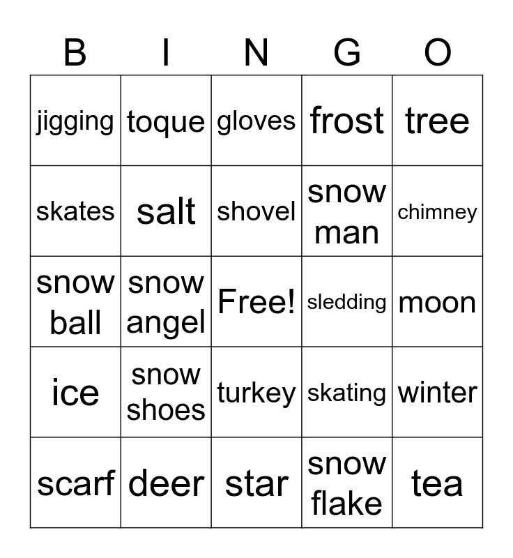 This bingo card has a free space and 28 words: winter, snowing, snow man, snow flake, skates, gloves, toque, ice, sledding, scarf, snow ball, frost, deer, star, chimney, fire, snow shoes, salt, shovel, turkey, jigging, hot chocolate, tea, snow angel, moon, skating, tree and socks.