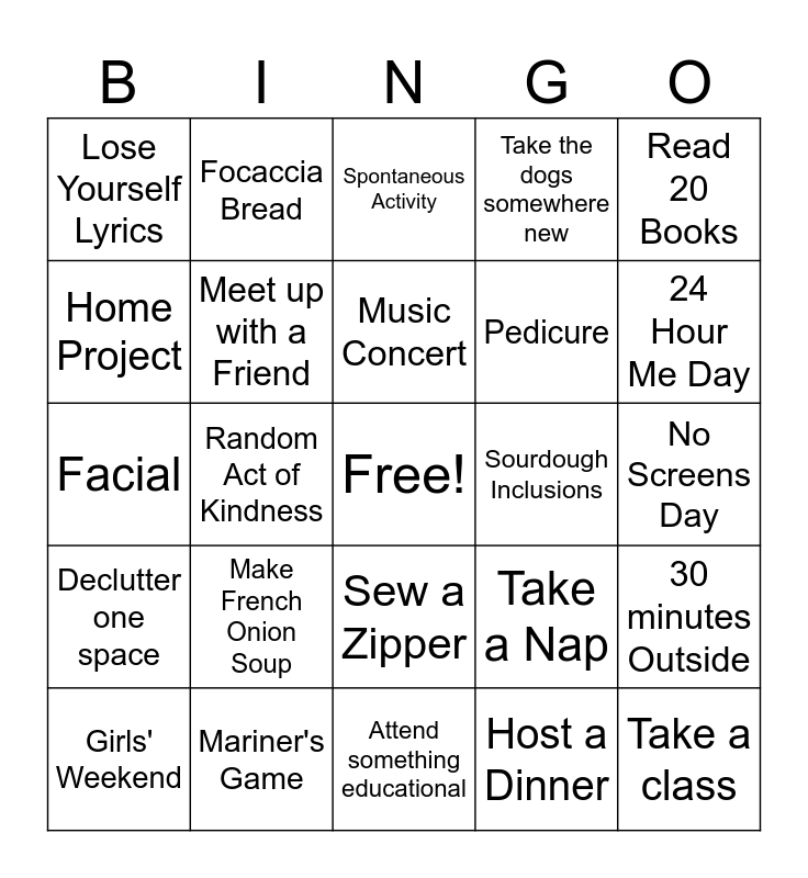 This bingo card has a free space and 24 words: Make French Onion Soup, Mariner's Game, Music Concert, Girls' Weekend, Read 20 Books, Lose Yourself Lyrics, Home Project, Focaccia Bread, Sourdough Inclusions, Sew a Zipper, Pedicure, Facial, Take a Nap, 30 minutes Outside, Meet up with a Friend, Host a Dinner, No Screens Day, Spontaneous Activity, 24 Hour Me Day, Random Act of Kindness, Take a class, Declutter one space, Take the dogs somewhere new and Attend something educational.