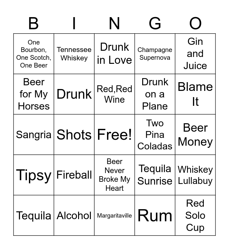 This bingo card has a free space and 25 words: Fireball, Margaritaville, Red,Red Wine, Tequila, Gin and Juice, One Bourbon, One Scotch, One Beer, Beer for My Horses, Tennessee Whiskey, Two Pina Coladas, Beer Never Broke My Heart, Drunk on a Plane, Sangria, Tequila Sunrise, Whiskey Lullabuy, Drunk, Whiskey Glasses, Beer Money, Drunk in Love, Blame It, Shots, Red Solo Cup, Alcohol, Tipsy, Champagne Supernova and Rum.