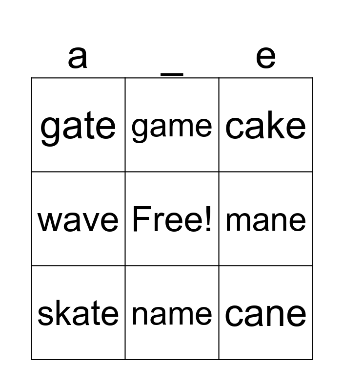 This bingo card has a free space and 12 words: tape, cape, cane, mane, game, cake, name, lake, gate, wave, skate and cave.