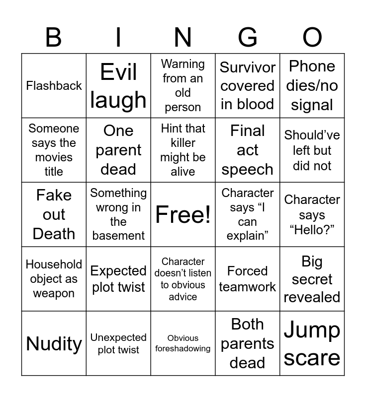This bingo card has a free space and 24 words: Expected plot twist, Unexpected plot twist, Hint that killer might be alive, Nudity, Phone dies/no signal, Flashback, Someone says the movies title, Evil laugh, Character says “I can explain”, Character doesn’t listen to obvious advice, Final act speech, Fake out Death, Forced teamwork, Big secret revealed, One parent dead, Both parents dead, Character says “Hello?”, Warning from an old person, Should’ve left but did not, Something wrong in the basement, Jump scare, Household object as weapon, Survivor covered in blood and Obvious foreshadowing.