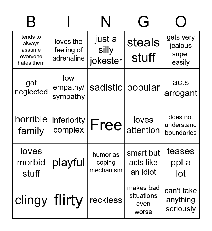 This bingo card has a free space and 24 words: playful, flirty, sadistic, clingy, gets very jealous super easily, tends to always assume everyone hates them, got neglected, loves the feeling of adrenaline, loves attention, humor as coping mechanism, popular, horrible family, smart but acts like an idiot, teases ppl a lot, low empathy/ sympathy, makes bad situations even worse, does not understand boundaries, just a silly jokester, acts arrogant, inferiority complex, can't take anything seriously, loves morbid stuff, steals stuff and reckless.