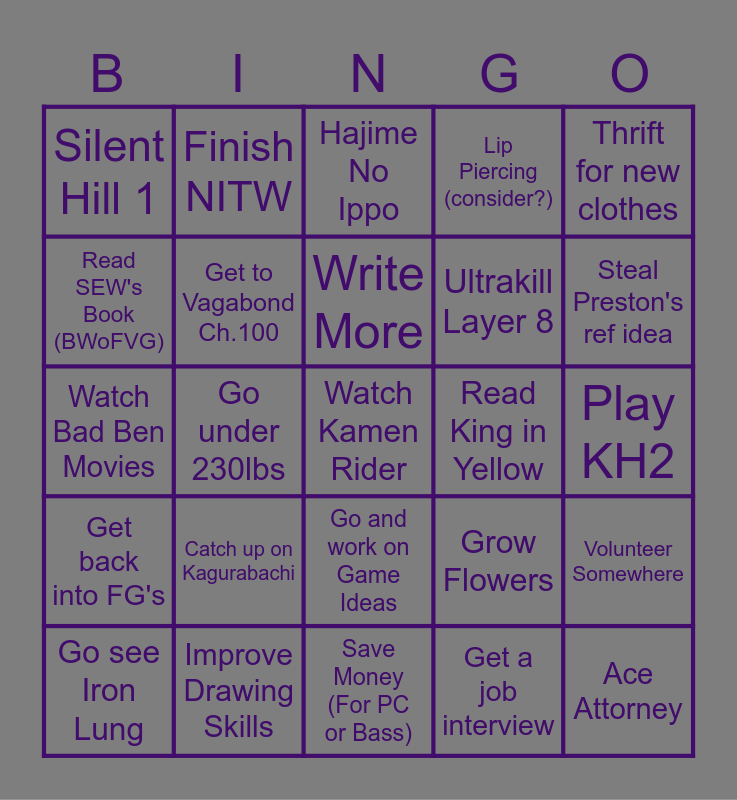 This bingo card has a free space and 24 words: Catch up on Kagurabachi, Improve Drawing Skills, Write More, Go see Iron Lung, Thrift for new clothes, Silent Hill 1, Read SEW's Book (BWoFVG), Finish NITW, Read King in Yellow, Go and work on Game Ideas, Ultrakill Layer 8, Watch Bad Ben Movies, Grow Flowers, Volunteer Somewhere, Get to Vagabond Ch.100, Get a job interview, Play KH2, Hajime No Ippo, Steal Preston's ref idea, Go under 230lbs, Ace Attorney, Get back into FG's, Lip Piercing (consider?) and Save Money (For PC or Bass).