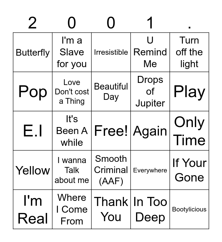 This bingo card has a free space and 57 words: Fallin, I'm Real, Family Affair, Butterfly, Thank You, Don't tell me', Love Don't cost a Thing, Hanging by a Moment, Drops of Jupiter, Jaded, U Remind Me, Hit Em Up Style, Survivor, it Wasn't Me, All for you, Angel, Turn off the light, It's Been A while, I'm Like a Bird, Bootylicious, Again, Let me Blow Your Mind, Everywhere, Irresistible, I Hope You Dance, Beautiful Day, Superman (Five for Fighting), The Space Between, Play, When It's Over, Drive, Be Like That, Peaches and Cream, Ride Wit Me, Only Time, Pop, Crazy (K-ci JoJo), E.I, Get Your freak On, Yellow, I'm a Slave for you, Smooth Criminal (AAF), Ms Jackson, Hermorrhage, Drowning, One Step Closer, I wanna Talk about me, Where I Come From, It's a Great day to be alive, You Rock My world, Clint Eastwood, In Too Deep, How you remind me, She Hates me, Lady Marmalade, If Your Gone and Follow me.