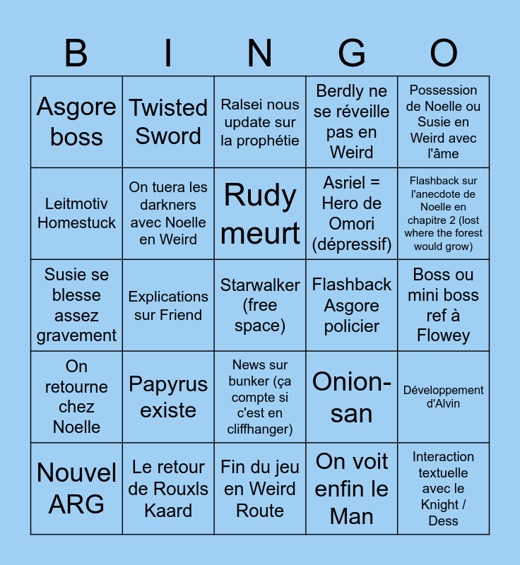 This bingo card has a free space and 24 words: Papyrus existe, Le retour de Rouxls Kaard, Rudy meurt, Nouvel ARG, Possession de Noelle ou Susie en Weird avec l'âme, Asgore boss, Leitmotiv Homestuck, Twisted Sword, Flashback Asgore policier, News sur bunker (ça compte si c'est en cliffhanger), Asriel = Hero de Omori (dépressif), Susie se blesse assez gravement, Onion-san, Développement d'Alvin, On tuera les darkners avec Noelle en Weird, On voit enfin le Man, Boss ou mini boss ref à Flowey, Ralsei nous update sur la prophétie, Flashback sur l'anecdote de Noelle en chapitre 2 (lost where the forest would grow), Explications sur Friend, Interaction textuelle avec le Knight / Dess, On retourne chez Noelle, Berdly ne se réveille pas en Weird and Fin du jeu en Weird Route.