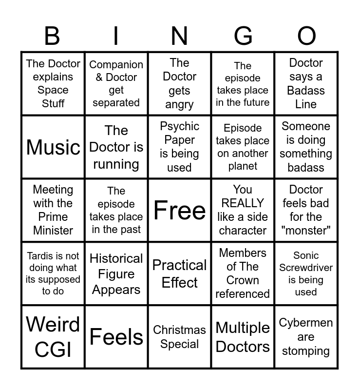 This bingo card has a free space and 38 words: The Doctor says Allons-Y!, A Character Dies, TARDIS Sound, The Doctor is running, Sonic Screwdriver is being used, Historical Figure Appears, Psychic Paper is being used, The Doctor is sorry., Doctor says a Badass Line, Episode takes place on another planet, The episode takes place in the past, The episode takes place in the future, Cybermen are stomping, Doctor feels bad for the "monster", Music, Tardis is not doing what its supposed to do, We meet an Alien that we have never seen before, The Doctor gets angry, Companion saves Doctor, You REALLY like a side character, The Doctor explains Space Stuff, Feels, Someone is doing something badass, Weird CGI, Feature Song, Christmas Special, Jack Harkness, River Song, Face of Boe, Cassandra, Last Human, Doctor wears a hat, Practical Effect, Multiple Doctors, Companion & Doctor get separated, Royalty appears, Members of The Crown referenced, Meeting with the Prime Minister and Dr. Who?.