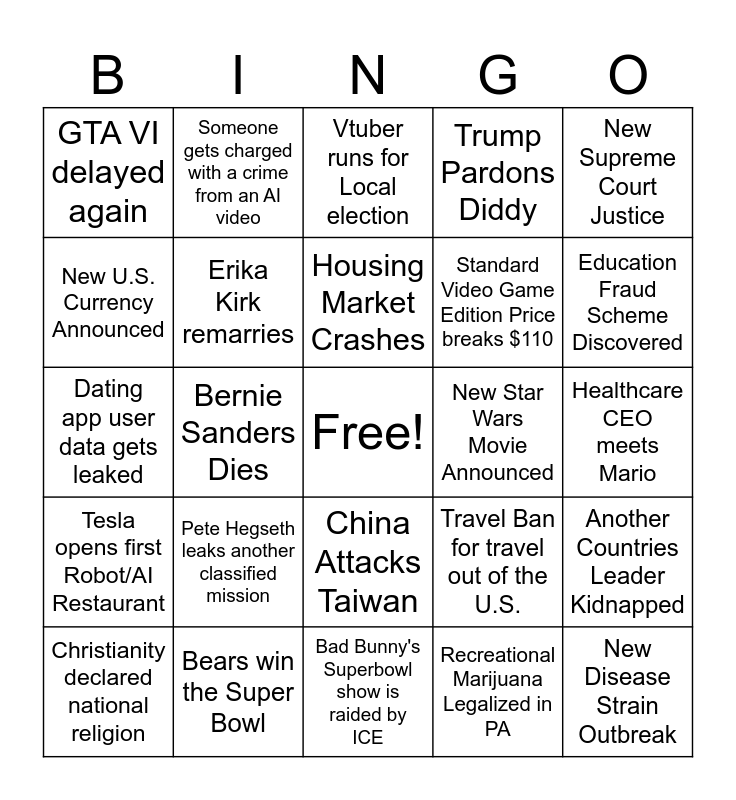 This bingo card has a free space and 24 words: Pete Hegseth leaks another classified mission, Bears win the Super Bowl, Housing Market Crashes, Christianity declared national religion, New Supreme Court Justice, GTA VI delayed again, New U.S. Currency Announced, Someone gets charged with a crime from an AI video, New Star Wars Movie Announced, China Attacks Taiwan, Standard Video Game Edition Price breaks $110, Dating app user data gets leaked, Travel Ban for travel out of the U.S., Another Countries Leader Kidnapped, Erika Kirk remarries, Recreational Marijuana Legalized in PA, Healthcare CEO meets Mario, Vtuber runs for Local election, Education Fraud Scheme Discovered, Bernie Sanders Dies, New Disease Strain Outbreak, Tesla opens first Robot/AI Restaurant, Trump Pardons Diddy and Bad Bunny's Superbowl show is raided by ICE.