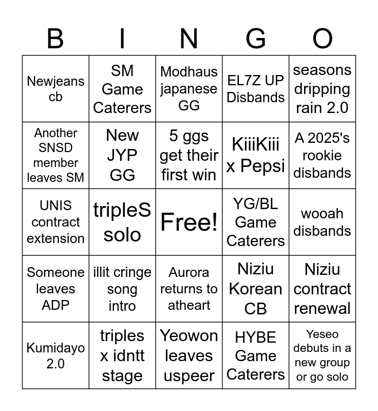 This bingo card has a free space and 24 words: illit cringe song intro, triples x idntt stage, 5 ggs get their first win, Kumidayo 2.0, seasons dripping rain 2.0, Newjeans cb, Another SNSD member leaves SM, SM Game Caterers, YG/BL Game Caterers, Aurora returns to atheart, KiiiKiii x Pepsi, UNIS contract extension, Niziu Korean CB, Niziu contract renewal, New JYP GG, HYBE Game Caterers, wooah disbands, Modhaus japanese GG, A 2025's rookie disbands, tripleS solo, Yeseo debuts in a new group or go solo, Someone leaves ADP, EL7Z UP Disbands and Yeowon leaves uspeer.