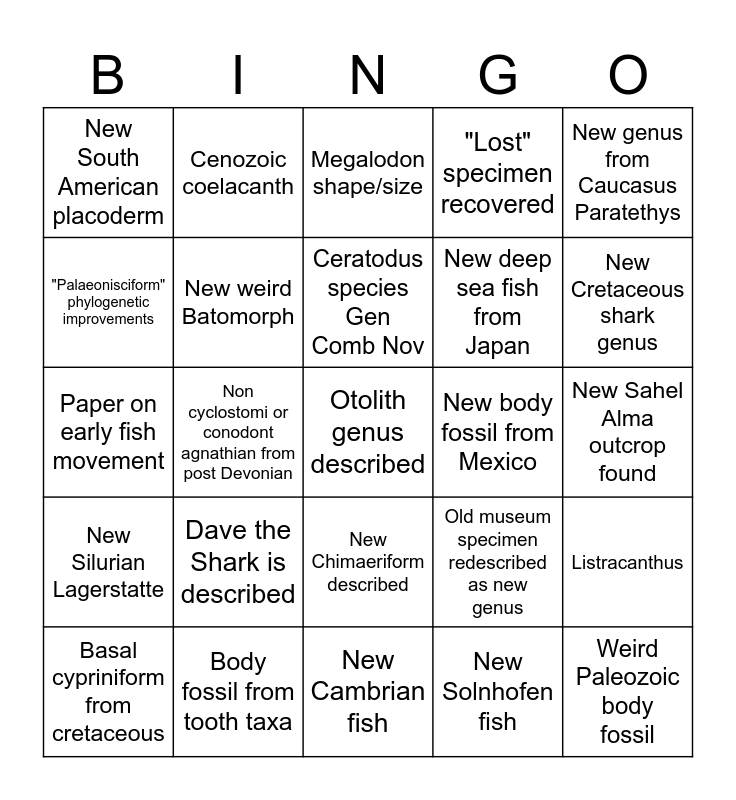 This bingo card has a free space and 24 words: Dave the Shark is described, Body fossil from tooth taxa, Ceratodus species Gen Comb Nov, Basal cypriniform from cretaceous, New genus from Caucasus Paratethys, New South American placoderm, "Palaeonisciform" phylogenetic improvements, Cenozoic coelacanth, New body fossil from Mexico, New Chimaeriform described, New deep sea fish from Japan, Paper on early fish movement, Old museum specimen redescribed as new genus, Listracanthus, New weird Batomorph, New Solnhofen fish, New Sahel Alma outcrop found, Megalodon shape/size, New Cretaceous shark genus, Non cyclostomi or conodont agnathian from post Devonian, Weird Paleozoic body fossil, New Silurian Lagerstatte, "Lost" specimen recovered and New Cambrian fish.
