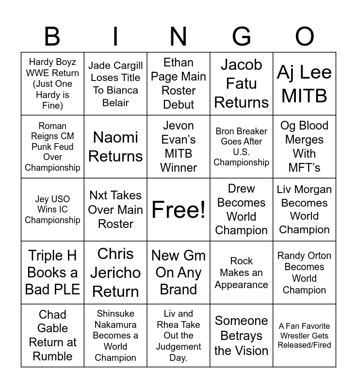 This bingo card has a free space and 24 words: Chad Gable Return at Rumble, Chris Jericho Return, Jevon Evan’s MITB Winner, Someone Betrays the Vision, Aj Lee MITB, Hardy Boyz WWE Return (Just One Hardy is Fine), Jade Cargill Loses Title To Bianca Belair, Ethan Page Main Roster Debut, Drew Becomes World Champion, Liv Morgan Becomes World Champion, Jey USO Wins IC Championship, Naomi Returns, Rock Makes an Appearance, Randy Orton Becomes World Champion, Roman Reigns CM Punk Feud Over Championship, Shinsuke Nakamura Becomes a World Champion, Liv and Rhea Take Out the Judgement Day., Jacob Fatu Returns, Og Blood Merges With MFT’s, Triple H Books a Bad PLE, Nxt Takes Over Main Roster, New Gm On Any Brand, Bron Breaker Goes After U.S. Championship and A Fan Favorite Wrestler Gets Released/Fired.