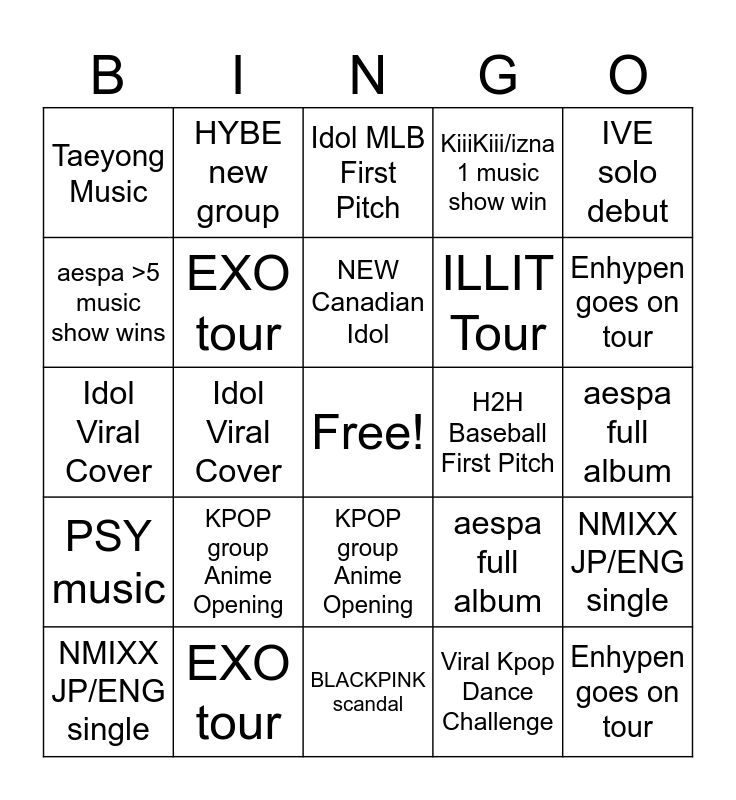 ⚠ This card has duplicate items: BTS wins a daesang (2), Enhypen goes on tour (2), H2H >2 comebacks (2), BLACKPINK scandal (2), KPOP group Anime Opening (2), PSY music (2), HYBE new group (2), IVE JP/ENG single (2), aespa >5 music show wins (2), BIG BANG >2 daesangs (2), EXO tour (2), KiiiKiii/izna 1 music show win (2), NMIXX JP/ENG single (2), aespa full album (2), CORTIS album (any size) (2), NEW South East Asian Idol (2), NEW Canadian Idol (2), H2H Baseball First Pitch (2), Idol MLB First Pitch (2), IVE solo debut (2), Idol Viral Cover (2), Viral Kpop Dance Challenge (2), Taeyong Music (2)