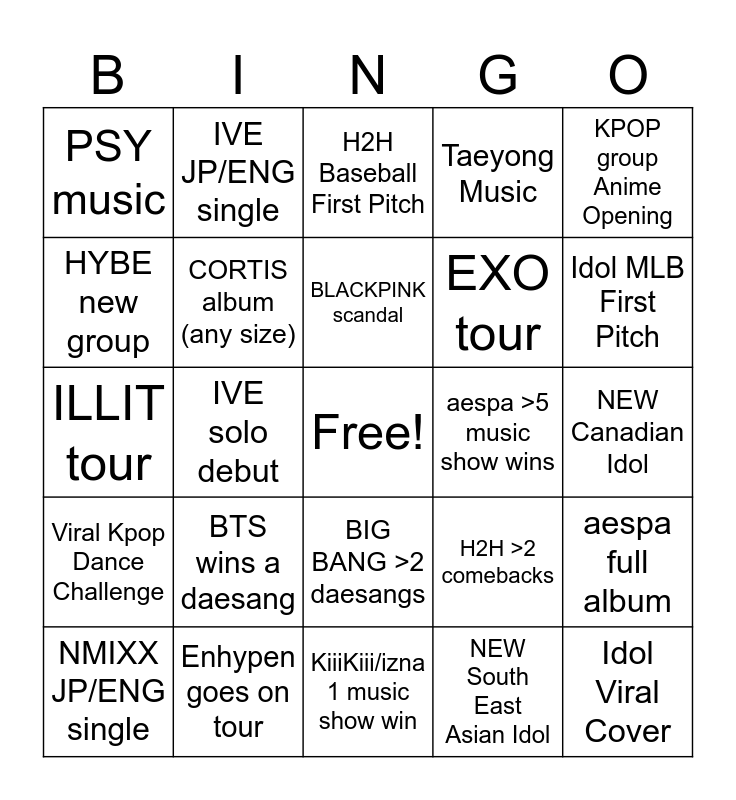 This bingo card has a free space and 24 words: BTS wins a daesang, Enhypen goes on tour, BLACKPINK scandal, NMIXX JP/ENG single, KPOP group Anime Opening, PSY music, HYBE new group, IVE JP/ENG single, aespa >5 music show wins, BIG BANG >2 daesangs, EXO tour, ILLIT tour, H2H >2 comebacks, aespa full album, CORTIS album (any size), NEW South East Asian Idol, NEW Canadian Idol, H2H Baseball First Pitch, Idol MLB First Pitch, IVE solo debut, Idol Viral Cover, Viral Kpop Dance Challenge, Taeyong Music and KiiiKiii/izna 1 music show win.