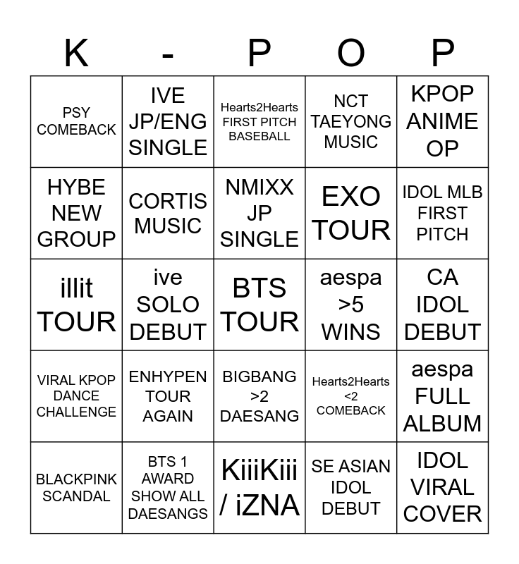 This bingo card has a free space and 24 words: ENHYPEN TOUR AGAIN, BTS 1 AWARD SHOW ALL DAESANGS, NMIXX JP SINGLE, BLACKPINK SCANDAL, KPOP ANIME OP, PSY COMEBACK, HYBE NEW GROUP, IVE JP/ENG SINGLE, aespa >5 WINS, BIGBANG >2 DAESANG, EXO TOUR, illit TOUR, Hearts2Hearts <2 COMEBACK, aespa FULL ALBUM, CORTIS MUSIC, SE ASIAN IDOL DEBUT, CA IDOL DEBUT, Hearts2Hearts FIRST PITCH BASEBALL, IDOL MLB FIRST PITCH, ive SOLO DEBUT, IDOL VIRAL COVER, VIRAL KPOP DANCE CHALLENGE, NCT TAEYONG MUSIC and KiiiKiii / iZNA.