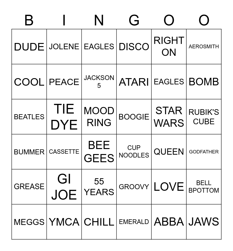 This bingo card has 36 words: GROOVY, 55 YEARS, EMERALD, COOL, BUMMER, BOOGIE, PEACE, CHILL, RIGHT ON, LOVE, BOMB, DISCO, BELL BPOTTOM, TIE DYE, ATARI, DUDE, GREASE, STAR WARS, BEATLES, EAGLES, MOOD RING, CASSETTE, CUP NOODLES, BEE GEES, QUEEN, JOLENE, EAGLES, YMCA, JACKSON 5, AEROSMITH, JAWS, MEGGS, GODFATHER, RUBIK'S CUBE, GI JOE and ABBA.
