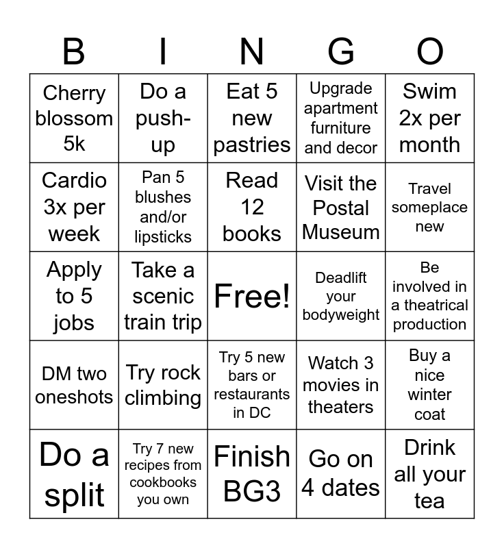 This bingo card has a free space and 24 words: Try rock climbing, Try 7 new recipes from cookbooks you own, Read 12 books, Do a split, Swim 2x per month, Cherry blossom 5k, Cardio 3x per week, Do a push-up, Deadlift your bodyweight, Try 5 new bars or restaurants in DC, Visit the Postal Museum, Apply to 5 jobs, Watch 3 movies in theaters, Buy a nice winter coat, Pan 5 blushes and/or lipsticks, Go on 4 dates, Be involved in a theatrical production, Eat 5 new pastries, Travel someplace new, Take a scenic train trip, Drink all your tea, DM two oneshots, Upgrade apartment furniture and decor and Finish BG3.