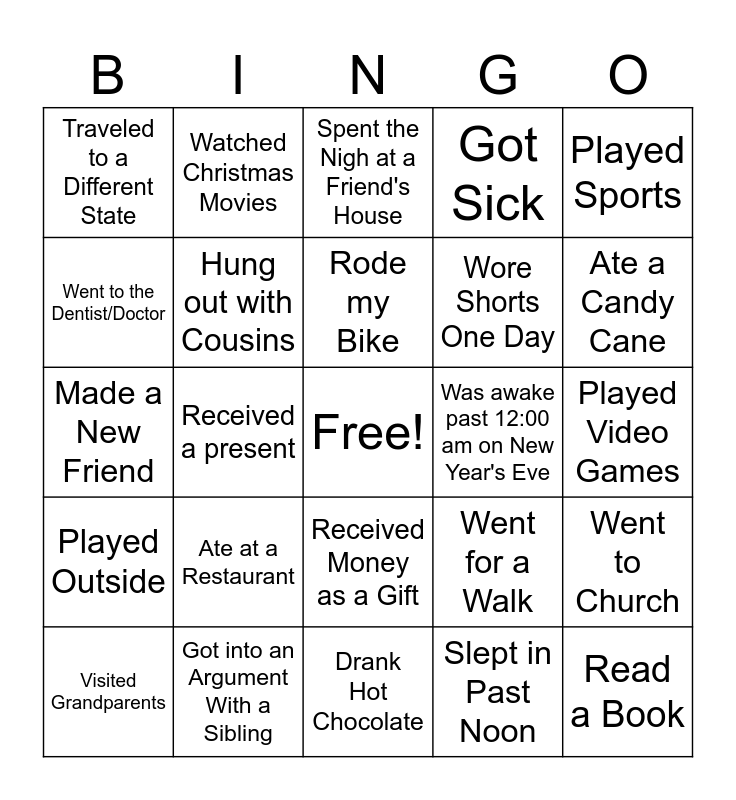 This bingo card has a free space and 29 words: Visited Grandparents, Stayed up Past Midnight on New Year's Eve, Received a present, Traveled Out of Town, Traveled to a Different State, Spent the Nigh at a Friend's House, Hung out with Cousins, Ate at a Restaurant, Was awake past 12:00 am on New Year's Eve, Got into an Argument With a Sibling, Played Video Games, Read a Book, Drank Hot Chocolate, Slept in Past Noon, Ate a Candy Cane, Watched Netflix, Received Money as a Gift, Played Outside, Played Sports, Made a New Friend, Went for a Walk, Forgot my Teacher's Name, Wore Shorts One Day, Went to the Dentist/Doctor, Got Sick, Watched Christmas Movies, Went to Church, Rode my Bike and Wrapped Gifts.