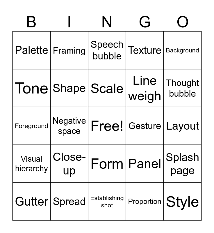 This bingo card has a free space and 35 words: Medium, Composition, Line, Shape, Form, Texture, Tone, Contrast, Scale, Perspective, Foreground, Background, Symbol, Motif, Palette, Gesture, Proportion, Negative space, Visual hierarchy, Style, Panel, Gutter, Splash page, Spread, Speech bubble, Thought bubble, Caption, Inking, Line weigh, Layout, Pacing, Establishing shot, Close-up, Framing and Thumbnail.