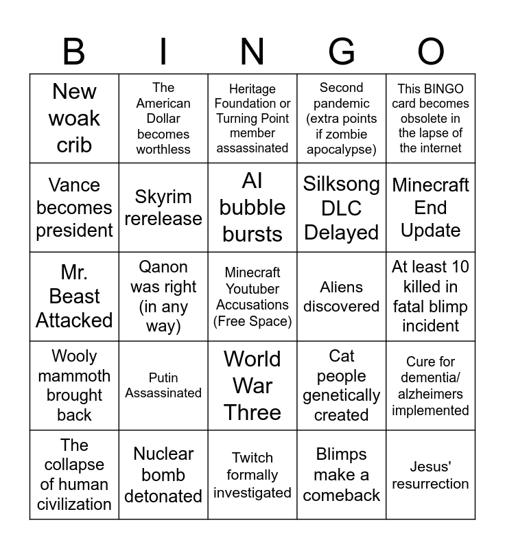 This bingo card has a free space and 24 words: Putin Assassinated, Nuclear bomb detonated, AI bubble bursts, The collapse of human civilization, This BINGO card becomes obsolete in the lapse of the internet, New woak crib, Vance becomes president, The American Dollar becomes worthless, Aliens discovered, World War Three, Silksong DLC Delayed, Mr. Beast Attacked, Cat people genetically created, Cure for dementia/ alzheimers implemented, Skyrim rerelease, Blimps make a comeback, At least 10 killed in fatal blimp incident, Heritage Foundation or Turning Point member assassinated, Minecraft End Update, Qanon was right (in any way), Jesus' resurrection, Wooly mammoth brought back, Second pandemic (extra points if zombie apocalypse) and Twitch formally investigated.
