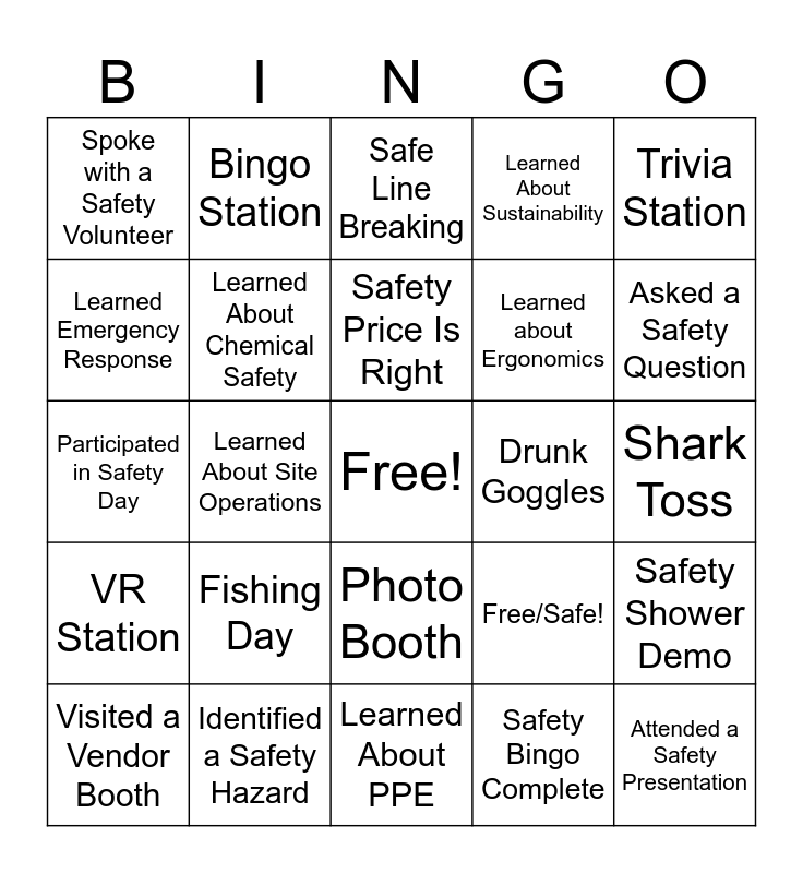 This bingo card has a free space and 25 words: Fishing Day, Learned About PPE, Safety Price Is Right, Visited a Vendor Booth, Trivia Station, Spoke with a Safety Volunteer, Learned Emergency Response, Bingo Station, Drunk Goggles, Photo Booth, Learned about Ergonomics, Participated in Safety Day, Free/Safe!, Safety Shower Demo, Learned About Chemical Safety, Department Lunch, Shark Toss, Safe Line Breaking, Asked a Safety Question, Learned About Site Operations, Attended a Safety Presentation, Identified a Safety Hazard, VR Station, Learned About Sustainability and Safety Bingo Complete.