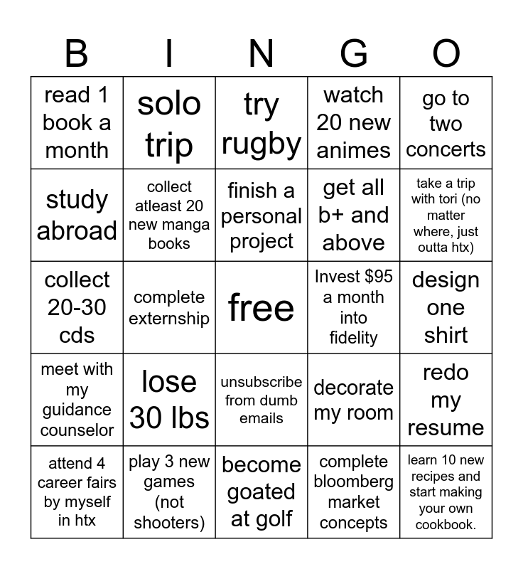 This bingo card has a free space and 24 words: attend 4 career fairs by myself in htx, lose 30 lbs, finish a personal project, complete bloomberg market concepts, go to two concerts, read 1 book a month, solo trip, try rugby, Invest $95 a month into fidelity, design one shirt, collect 20-30 cds, collect atleast 20 new manga books, decorate my room, redo my resume, study abroad, play 3 new games (not shooters), become goated at golf, watch 20 new animes, take a trip with tori (no matter where, just outta htx), meet with my guidance counselor, complete externship, unsubscribe from dumb emails, get all b+ and above and learn 10 new recipes and start making your own cookbook..