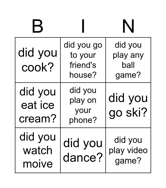 This bingo card has a free space and 11 words: did you swim?, did you dance?, did you play video game?, did you watch moive, did you go to your friend's house?, did you play any ball game?, did you go ski?, did you read?, did you eat ice cream?, did you cook? and did you listen to music?.