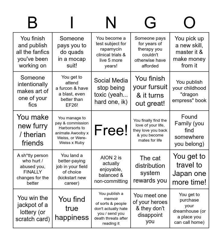 This bingo card has a free space and 24 words: You land a better-paying job in your field of choice (kickstart new career), You find true happiness, Social Media stop being toxic (yeah... hard one, ik), You win the jackpot of a lottery (or scratch card), You pick up a new skill, master it & make money from it, You finish and publish all the fanfics you've been working on, Someone intentionally makes art of one of your fics, Someone pays you to do quads in a mocap suit!, You finally find the love of your life, they love you back & you become mates for life, AION 2 is actually enjoyable, balanced & non-committing, You finish your fursuit & it turns out great!, You make new furry / therian friends, The cat distribution system rewards you, You get to travel to Japan one more time!, You get to attend a furcon & have a blast, even better than EF26!, You meet one of your heroes & they don't disappoint you, Found Family (you find somewhere you belong), You become a test subject for rapamycin clinical trials & live 5 more years!, You publish your childhood "dragon empress" book, You manage to pay & commission Harborsorts to animate Awooby x Weiss, or Were-Weiss x Ruby, You get to purchase your dreamhouse (or a place you can call home), A sh*tty person who hurt / abused you, FINALLY changes for the better, Someone pays for years of therapy you couldn't otherwise have afforded and You publish a memoir of sorts & people don't actually hate you / send you death threats after reading it.