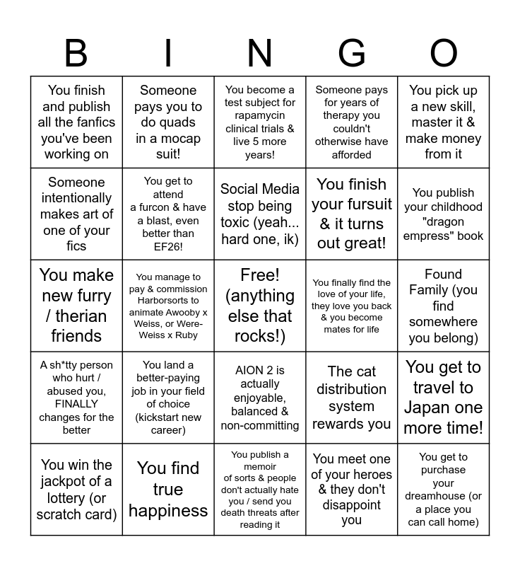 This bingo card has a free space and 24 words: You land a better-paying job in your field of choice (kickstart new career), You find true happiness, Social Media stop being toxic (yeah... hard one, ik), You win the jackpot of a lottery (or scratch card), You pick up a new skill, master it & make money from it, You finish and publish all the fanfics you've been working on, Someone intentionally makes art of one of your fics, Someone pays you to do quads in a mocap suit!, You finally find the love of your life, they love you back & you become mates for life, AION 2 is actually enjoyable, balanced & non-committing, You finish your fursuit & it turns out great!, You make new furry / therian friends, The cat distribution system rewards you, You get to travel to Japan one more time!, You get to attend a furcon & have a blast, even better than EF26!, You meet one of your heroes & they don't disappoint you, Found Family (you find somewhere you belong), You become a test subject for rapamycin clinical trials & live 5 more years!, You publish your childhood "dragon empress" book, You manage to pay & commission Harborsorts to animate Awooby x Weiss, or Were-Weiss x Ruby, You get to purchase your dreamhouse (or a place you can call home), A sh*tty person who hurt / abused you, FINALLY changes for the better, Someone pays for years of therapy you couldn't otherwise have afforded and You publish a memoir of sorts & people don't actually hate you / send you death threats after reading it.