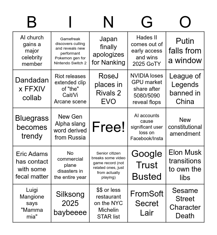This bingo card has a free space and 24 words: No commercial plane disasters in the entire year, Silksong 2025 baybeeee, RoseJ places in Rivals 2 EVO, Luigi Mangione says "Mamma mia", Putin falls from a window, AI church gains a major celebrity member, Dandadan x FFXIV collab, Gamefreak discovers culling and reveals new performant Pokemon gen for Nintendo Switch 2, AI accounts cause significant user loss on Facebook/Insta, Senior citizen breaks some video game record (not related ones, just from actually playing), NVIDIA loses GPU market share after 5080/5090 reveal flops, Bluegrass becomes trendy, Google Trust Busted, Elon Musk transitions to own the libs, Riot releases extended clip of "the" Cait/Vi Arcane scene, FromSoft Secret Lair, New constitutional amendment, Japan finally apologizes for Nanking, League of Legends banned in China, New Gen Alpha slang word derived from Russia, Sesame Street Character Death, Eric Adams has contact with some fecal matter, Hades II comes out of early access and wins 2025 GoTY and $$ or less restaurant on the NYC Michelin STAR list.