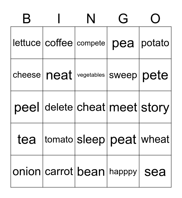 This bingo card has a free space and 24 words: tomato, carrot, vegetables, onion, potato, lettuce, cheese, coffee, meet, sleep, sweep, peel, peat, wheat, neat, happpy, story, compete, pete, delete, sea, tea, pea and bean.